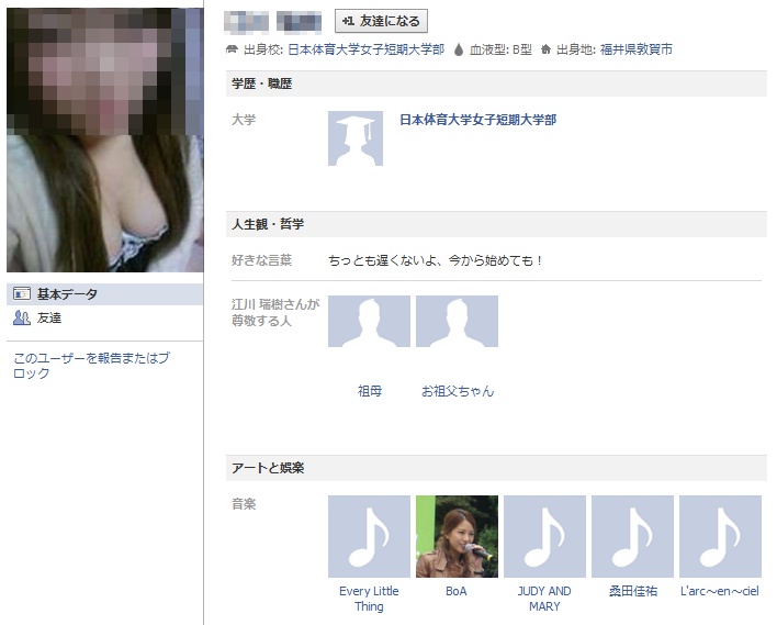 メッセージを送ろうかどうしようかずっと悩んでたんですけど、思い切ってメッセージを送ってみます。私の友達があなたに興味を持ってるみたいで、何度かページを見てるんです。よかったらメールとかで直接話してみてくれませんか?その子は22歳の可愛い系の子で、ぱっと見は森下まいちゃんをもっと可愛くした感じの雰囲気です。写真とか勿論あるんですけど、こんなメッセージいきなりで断られたら目も当てられないので一回返事もらえますか?携帯は xxxxxxxx@ezweb.ne.jp です。そしたら写真送るんで見てもらった上でよければ話してみてください。私は友達ですが、ななみがfacebookに登録していなくて連絡が出来ないので私からメッセージを送りました。facebook内でやりとりするの面倒なんで返信じゃなくて携帯の方にメール下さい♪無理だったらスルーで!
